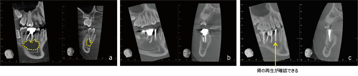 In most cases, the tooth is extracted or a "root tip resection" is performed, in which the tip of the root is cut off and the bag of pus is removed. In this case, EMAT was performed after the usual root canal treatment for three teeth. Picture C is a radiograph taken 2 years and 1 month after the EMAT procedure. There is no effective nonsurgical treatment for root cysts. In this case, the resorbed bone began to regenerate in about 3 months after EMAT, and about 2 years later, the resorbed bone area, which was 30 mm in diameter, was regenerated.