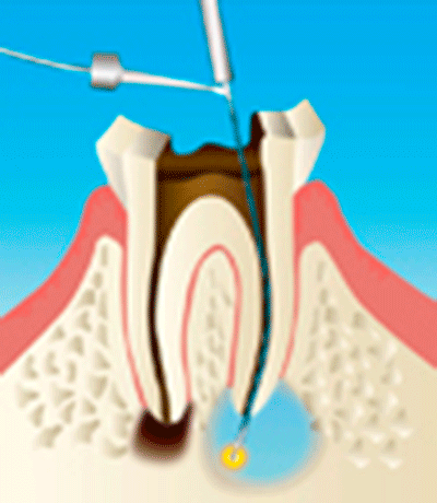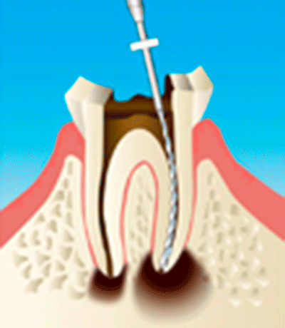 • (2) Anesthesia is given and the inside of the root is cleaned out using a special instrument called a file. Roots of teeth are finely branched like tree roots, and it is difficult to clean all of them.